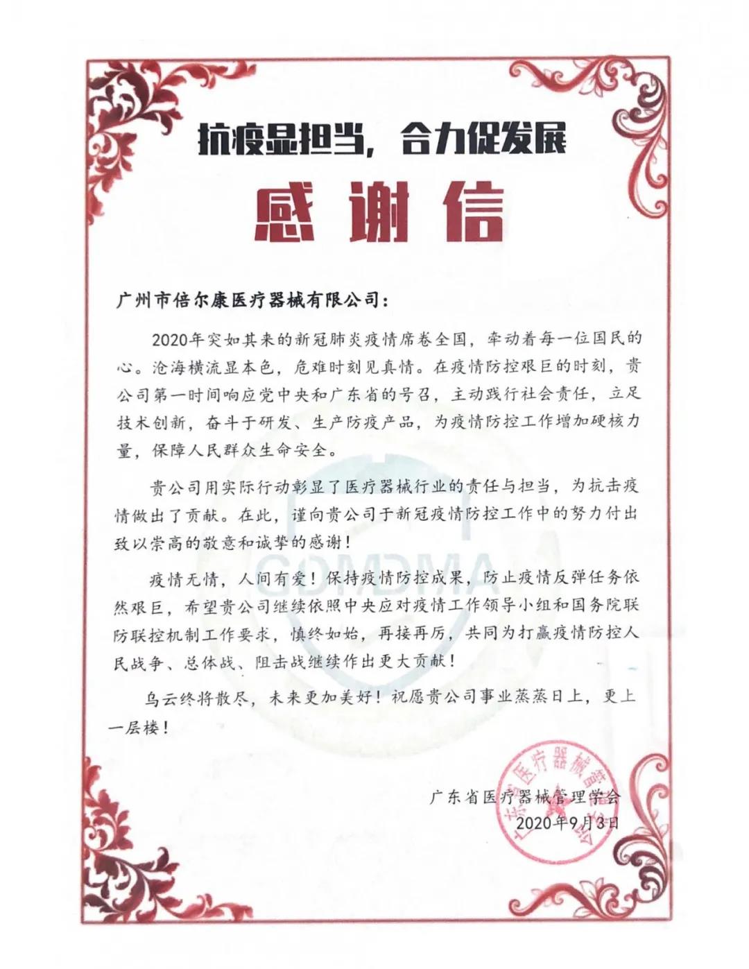 在現(xiàn)場,倍爾康收到了廣東省醫(yī)療器械管理學(xué)會的感謝信——對倍爾康在疫情期間加班加點保質(zhì)量促生產(chǎn),發(fā)揚廣東省醫(yī)療器械大愛無疆的奉獻精神,助力一線防控表示感謝!